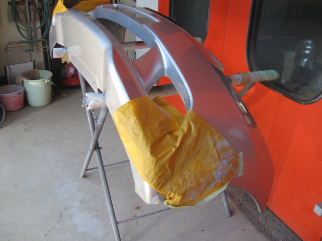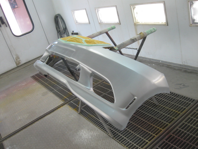 塗装@ フロントグリルをマスキングで養生、脱脂・清掃・足付けをします。