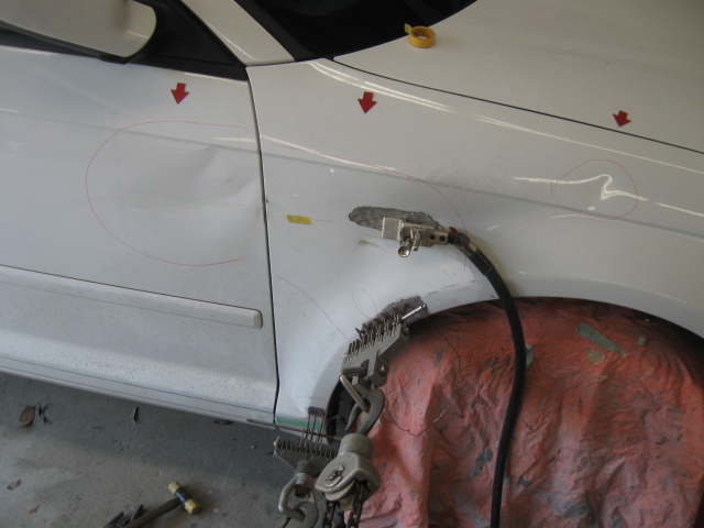 アウディA3の右側フロントフェンダーとフロントドア、凹みをフレーム修正機で引き出します。