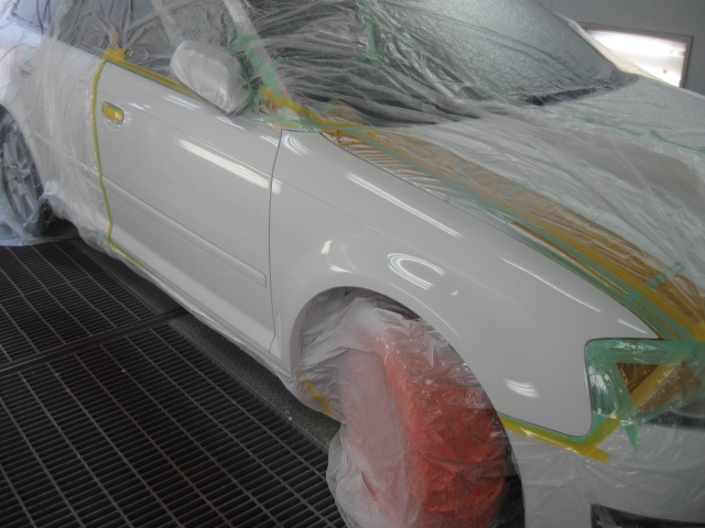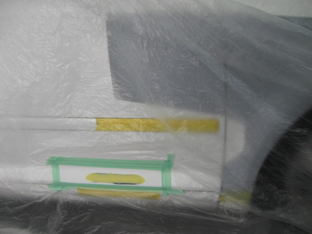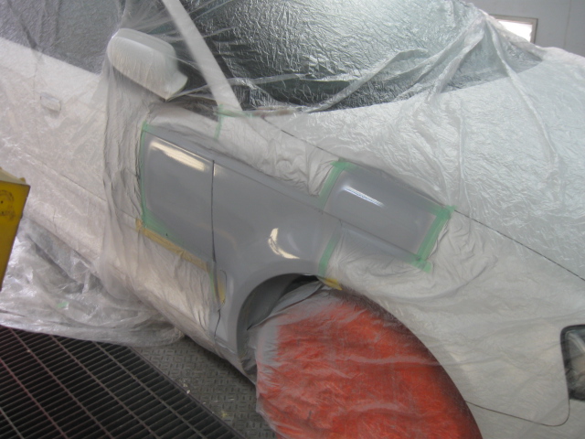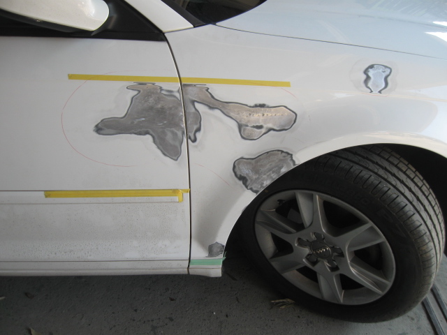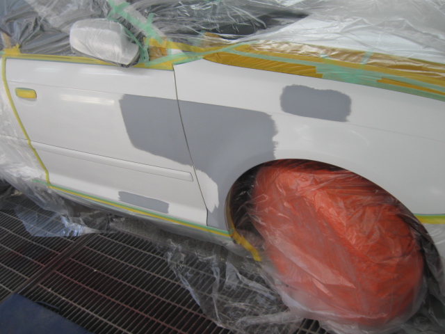 パテ修理A パテを数回、盛って研いでを繰り返し、修理します。フロントフェンダーの地肌が黒いのは、以前、新品パーツに交換使用されています。