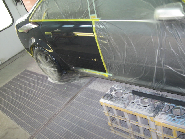 サフェーサーを塗布します。サフを細かいペーパーで研ぎます。脱脂、清掃、足付けをします。サフェーサーには防錆・防水効果があり、パテを砥いだ時の、粗いペーパー目消しをします。塗装養生の為、マスキングをします。