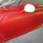 BMW・ミニ・クーパーDは、フロントフェンダーにポールに当てた凹みと、ドアにもキズ状の、凹みがあります。これを板金します。塗装を剥がすと、通常は下地はグレーですが、鮮やかなレッドにする為、ホワイトのサフェーサーが、塗装されています。